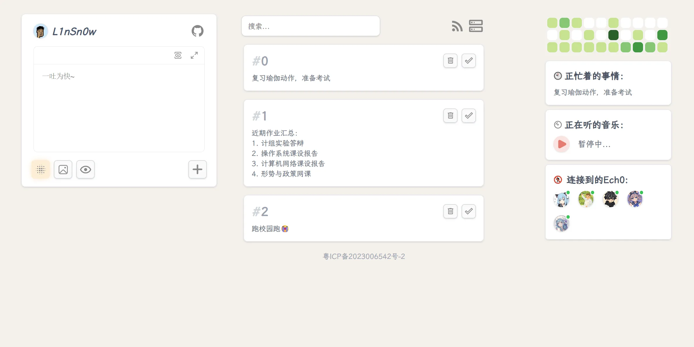 “Tika已死,Tika永生!“ 好吧,我想说的是停止使用Tika并不代表我没有记录Todo的需求,我在上面的提到Ech0里加入了类似Todo的功能,这一次,我希望尽可能的简单,简单到只能使用纯文本记录最多三条代办事项,仅此而已,没有截至日期,记录下的todo可以删除或者Mark As Done。并且默认展示三条todo中优先级最高的一条于首页,现在它更多的是备忘,而最多三条todo的限制使得你不得不考虑当下最该被完成的事情,而不是一股脑全不添加上去,是的,记录短期的Todo而非长期的! 也许在使用足够长的使用时间后,我才能验证这种设计对于我是否有效,这放在我以后的文章里在聊吧(没忘记的话)。